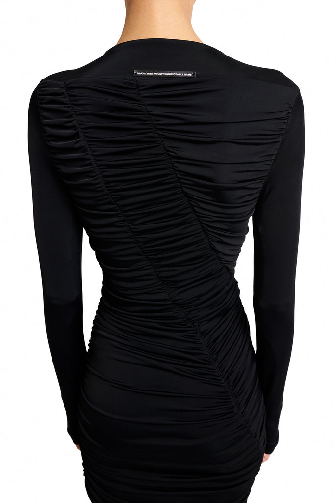 Elegant black jersey dress featuring sophisticated gathered detailing that creates flattering movement and dimension. The fluid fabric drapes beautifully against the body, offering both comfort and refined style. Perfect for transitioning from day to evening, this versatile piece pairs effortlessly with accessories for any occasion. The gathered construction adds visual interest while maintaining a polished, understated aesthetic that works season after season.