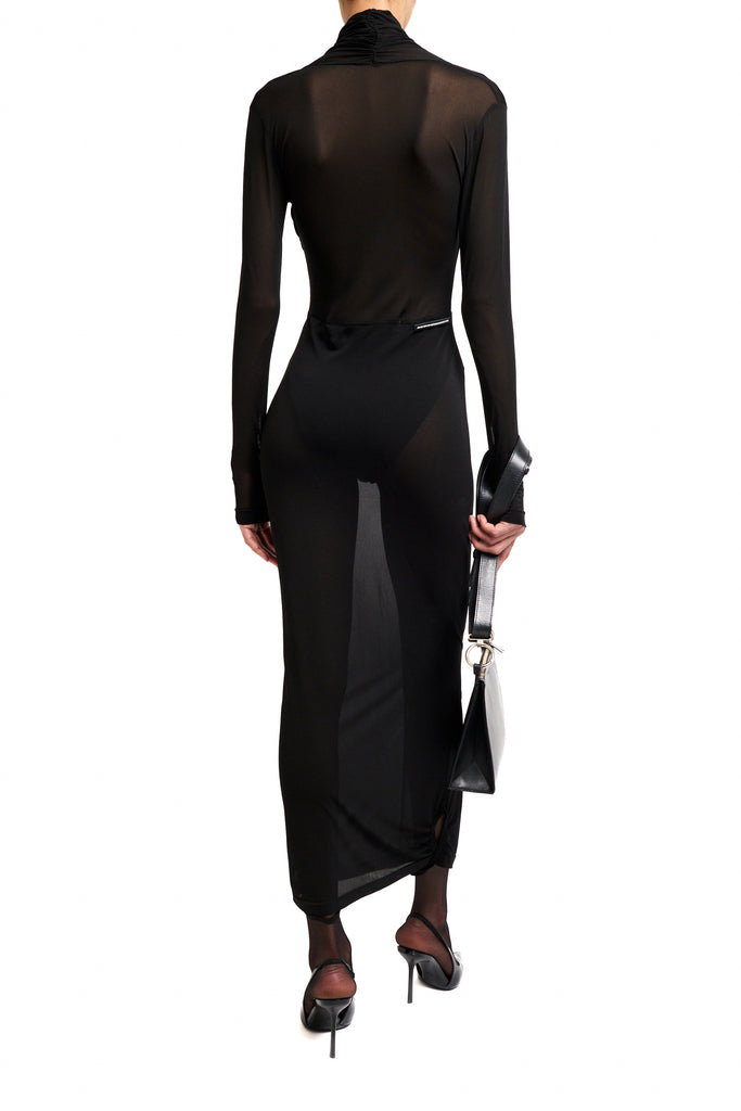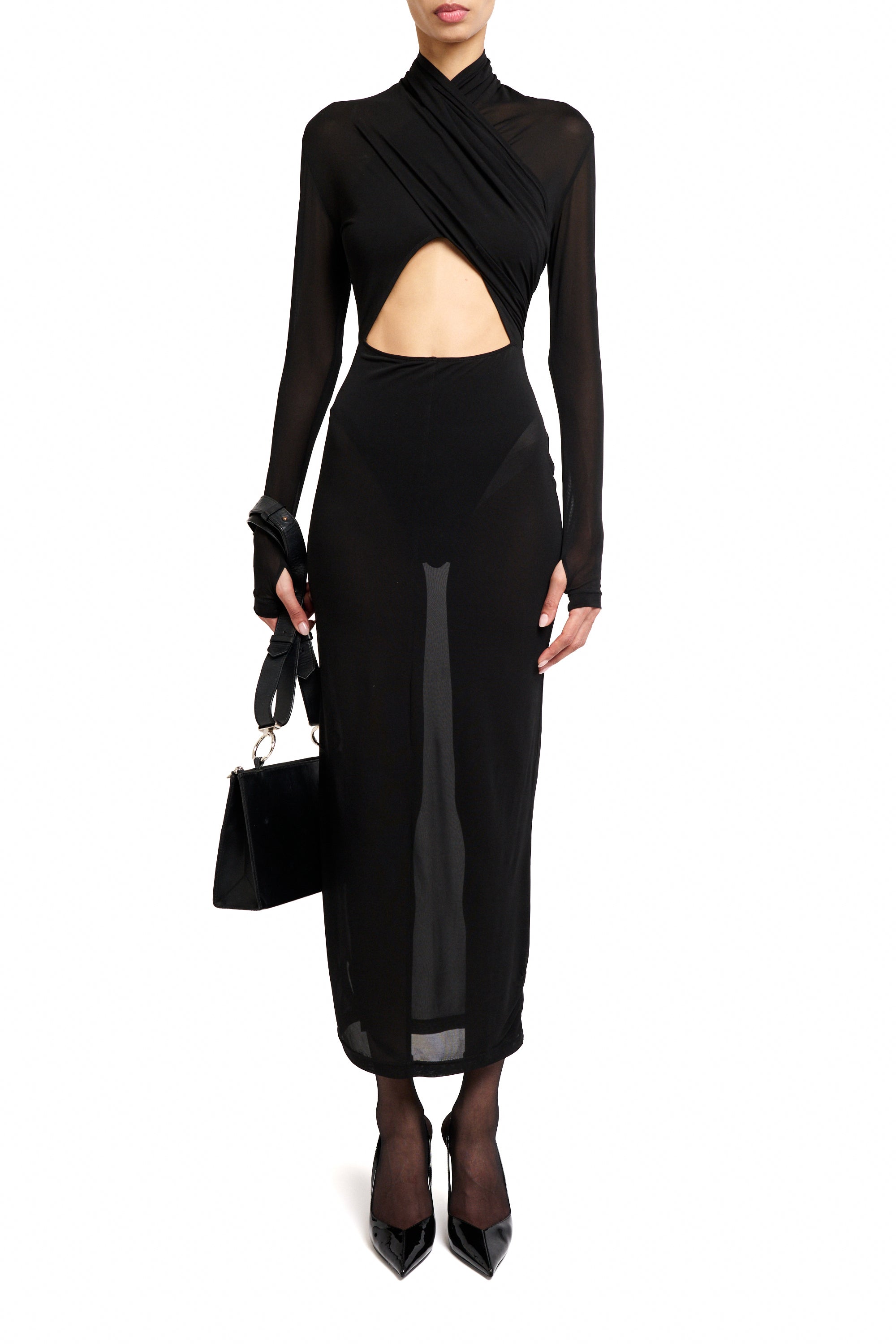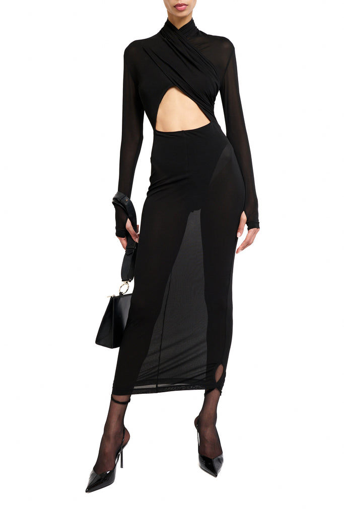 Introducing the Black Dress Silence, a sophisticated piece that seamlessly blends elegance with contemporary design. This sheer black gown features extended sleeves and a striking cutout detail that creates visual intrigue while maintaining refined sensuality. The draped neckline adds an element of fluid grace, allowing the fabric to move naturally with your silhouette. Perfect for evening events or upscale occasions, this dress commands attention through its minimalist yet bold aesthetic. The see-through composition demands confidence and pairs beautifully with understated accessories to let the garment's architectural details take center stage.